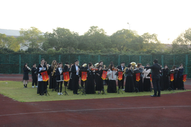 伴随着洪亮的一声“正步走”,国旗护卫队迈着矫健的步伐走到升旗台,在交响管乐团的现场演奏声中,全体师生奏唱国歌,行注目礼,鲜艳的五星红旗缓缓上升迎风飘扬。
