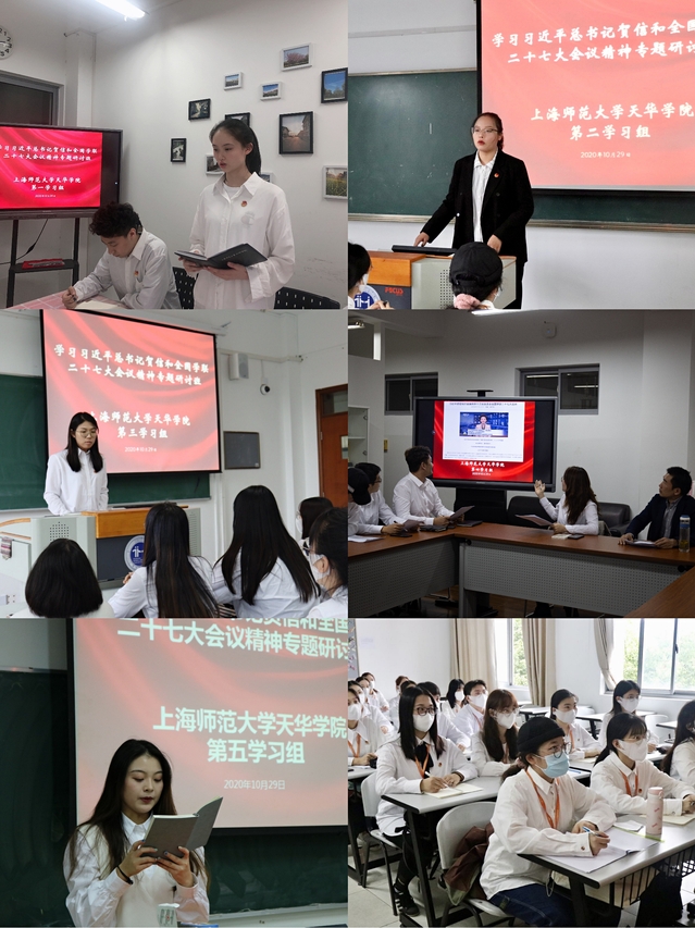 下午13:30——13:30各二级学院分团委积极响应号召,认真落实各学院学生干部学习研讨活动。统一下发学习研讨记录表和思考议题,深入学习宣传贯彻习近平总书记贺信及全国学联二十七大会议精神。参训人员结合上海师范大学天华学院学生实际情况进行分析讨论,就如何提升自我、服务同学、为国家作贡献等方面对学习成果进行发言,深入交流学习培训成果。 各小组以不同的视角开展了专题学习讨论工作。