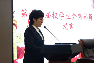 第十四届校学生会新部员代表靳婉晴发言。靳婉晴同学首先代表新一批部员向各位老师和学长学姐们表示感谢,接着从三个方面表达了对未来各项工作的态度和初心,希望全体新成员们在这个大家庭里不断完善自己、磨练自己、提升自己!