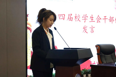会上,第十四届校学生会干部代表钱嘉怡发言。钱嘉怡同学首先对加入校学生会的各位新成员表示祝福,然后结合个人的工作经历,分享在学生会期间收获到的经验和技能。与此同时,对学生会成员们提出两点希望:一是学会承担、学会找平衡点,无论何时都坚守初心,踏实热忱地完成工作;二是要将“为全校师生服务”的宗旨,经久不衰地届届传递,散发出独有的青春光芒。