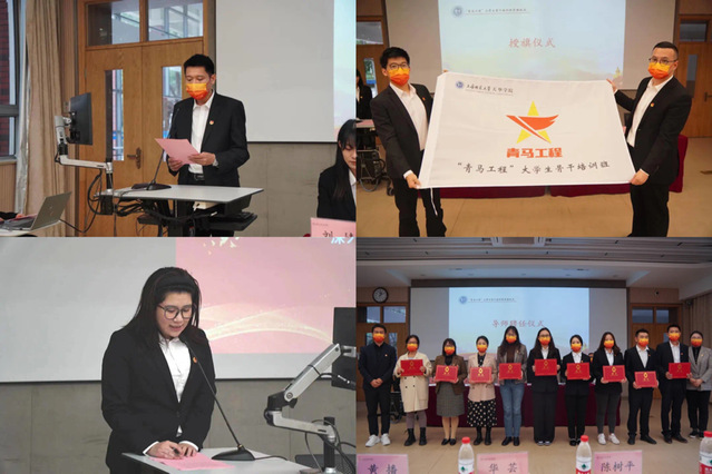 随后,校团委副书记王晓亮老师,宣读了本期青马工程培养实施方案。校团委副书记沈捷老师向学员代表授旗。学保处副处长、校团委书记杨央老师宣读导师聘任决定。学保处常务副处长包静波老师、马克思主义学院院长助理张旭老师共同为“理论导师”“实践导师”颁发聘书。期望导师们将初心落在行动上、把使命担在肩膀上,将本届青马工程大骨班学员们都培养成优秀骨干。