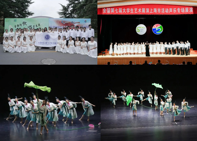 我校艺术团奔赴第七届全国大学生艺术展演上海市活动现场。该活动将“厚植国家情怀,涵养进去品格”作为活动主题,以当代大学生与国、与时代前行的价值追求展开。我校艺术团经过无数日夜的集中攻关,不断推翻重构,只为打磨与耐心筹备。最终四支队伍踌躇满志、齐驱并进,在不同的舞台各显精彩。无论是管乐齐鸣共奏交响乐章、弦凝指咽附和笙磬合卺,亦或激情与诗意的舞姿、唱响四野风声于花海,他们肆意点缀舞台光影,带来极致视听表演。