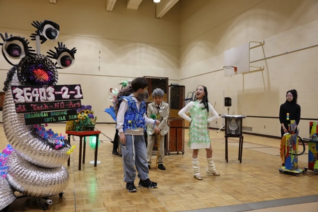头脑奥林匹克比赛(OM)是一项培养青少年创造力的活动,学生通过团队合作,创造性地解决问题。在头脑奥林匹克比赛中,一切没有标准答案,学生可以发挥天马星空的想象和白日做梦的精神。在今年的长期题题目中,当电影和现实交织,当AI遇上装置,当古典遇上滑稽,当科幻场景出现了承重结构,当表演打破时空界限……会发生什么?在参赛队员“太空深处的结构”题目的演绎中,太空深处的科学家可以是一只兔子,也可以是一个吸血鬼。在“人工智能装置”题目比赛中,上海市大宁国际小学在情节设计上,利用装置穿越回过去和梵高相遇,实现未来和过去的对话,共同探讨艺术的本质。“古典……滑稽反常的首演”题目中要求创作意想不到的声效,上海外国语大学附属外国语学校参赛队员先后尝试封箱带的撕拉声、干燥剂的沙沙声等不同的剧情效果,最后敲定用塑料螺纹管里放上啤酒瓶盖,通过风琴收拉的形式发出了意想不到的声效,引发场内观众连连笑声。在“汽车影院”题目比赛中,上海市向明中学制作的穿越机器道具,由一根推杆电机通过注射器和软管组成液压装置操作四扇门开关,以最低的成本实现最佳的视觉效果。上海师范大学天华学院在准备过程中,遇到了系统稳定性和实时数据处理的难题。在教练陈郑泱和李忠唐的指导下,他们采用敏捷开发方法,分阶段测试和迭代优化,最终成功解决了技术瓶颈,确保每个模块的功能稳定运行。从情景创设、情节创作到道具制作、技术攻关和表演风格,参赛队员脑洞大开,给出自己的解决方案。