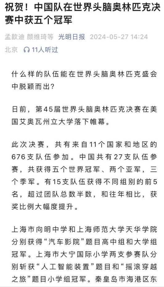 新闻链接:祝贺!中国队在世界头脑奥林匹克决赛中获五个冠军