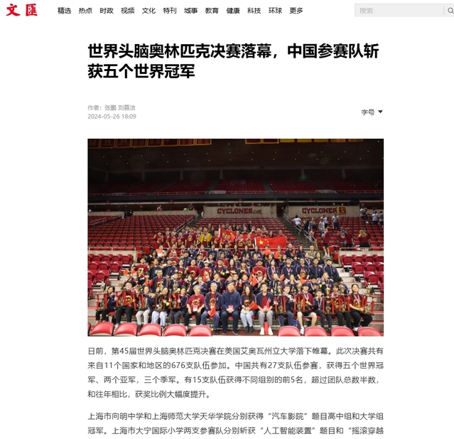 新闻链接:世界头脑奥林匹克决赛落幕,中国参赛队斩获五个世界冠军