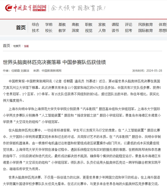 新闻链接:世界头脑奥林匹克决赛落幕 中国参赛队伍获佳绩-中国教育新闻网 (jyb.cn)