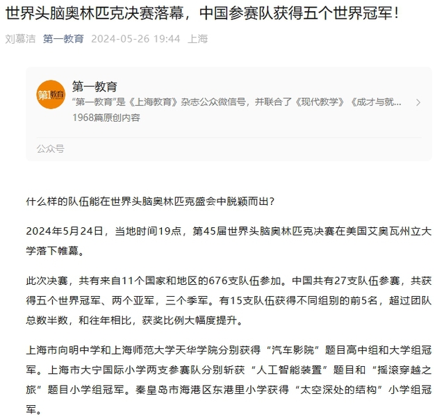 新闻链接:世界头脑奥林匹克决赛落幕,中国参赛队获得五个世界冠军! (qq.com)