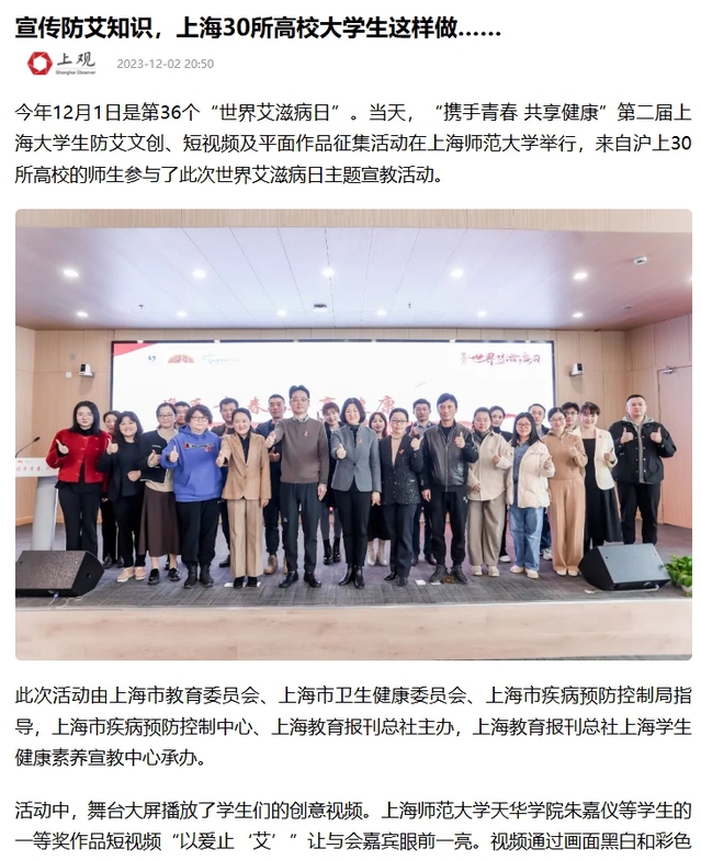 新闻链接:宣传防艾知识,上海30所高校大学生这样做…… (shobserver.com)