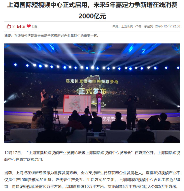 标题:上海国际短视频中心正式启用,未来5年嘉定力争新增在线消费2000亿元