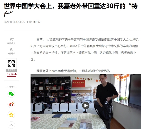 标题:世界中国学大会上,我嘉老外带回重达30斤的“特产”