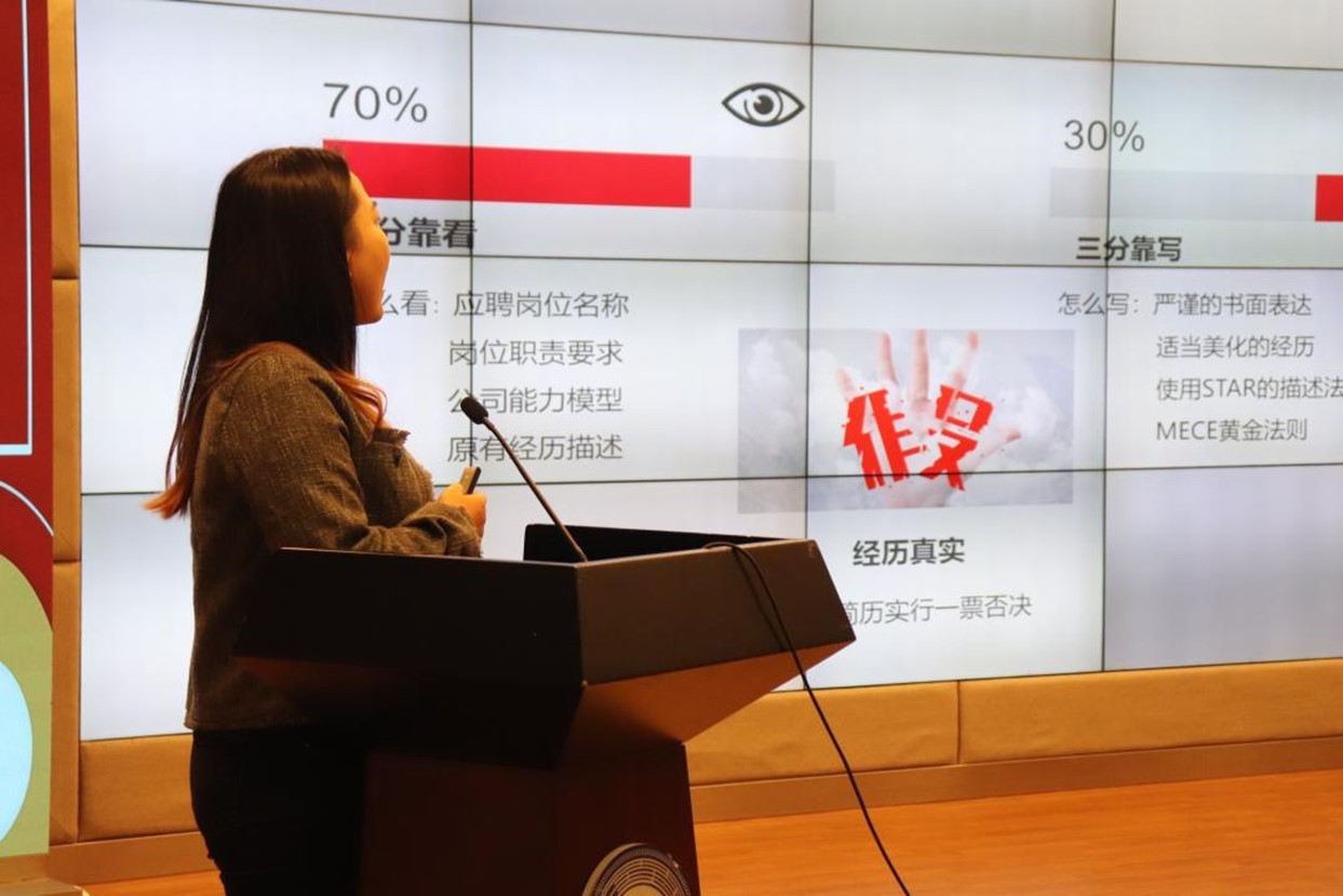 生涯讲座环节,高顿教育小马生涯工作室的生涯规划讲师罗纯老师以“求职不迷茫”为主题,从HR评价标准中的优秀简历和面试技巧两方面入手,深入剖析了目前的就业环境,向同学们详细讲解了如何更好地认识个人的最大优点,如何才能真正提供一份实用且符合标准格式及内容要求的简历。她针对简历中应遵循的语言规范及相关技巧做了详细指导,同时以互动的方式为同学们模拟了面试环节可能遇到的各类棘手问题,并提供了解决方案与指导,并就小马生涯工作室如何为大家实现职业规划提供帮助进行了细致说明。此外,罗老师教会了大家如何解读各种面试形式,深入理解目标行业、公司和职位,从而帮助同学们找到适合自己的发展路线。