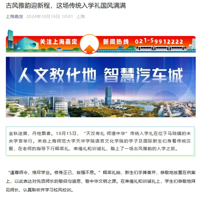 金秋送爽,丹桂飘香。10月15日,“天汉有礼 师道中华”传统入学礼在位于马陆镇的未央学宫举行。来自上海师范大学天华学院语言文化学院的学子及国际新生们身着传统汉服,在老师的指导下行释菜礼、束脩礼和训诫礼,踏上了一场古风雅韵的入学之旅。