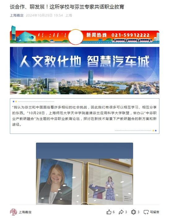 “我认为芬兰和中国面临着许多相似的社会挑战,因此我们有很多可以相互学习、相互分享的东西。”10月28日,上海师范大学天华学院邀请芬兰应用科学大学联盟,举办以“中芬职业产教研融合”为主题的中芬职业教育论坛,探讨在新技术背景下产教研融合的新方案和新途径。