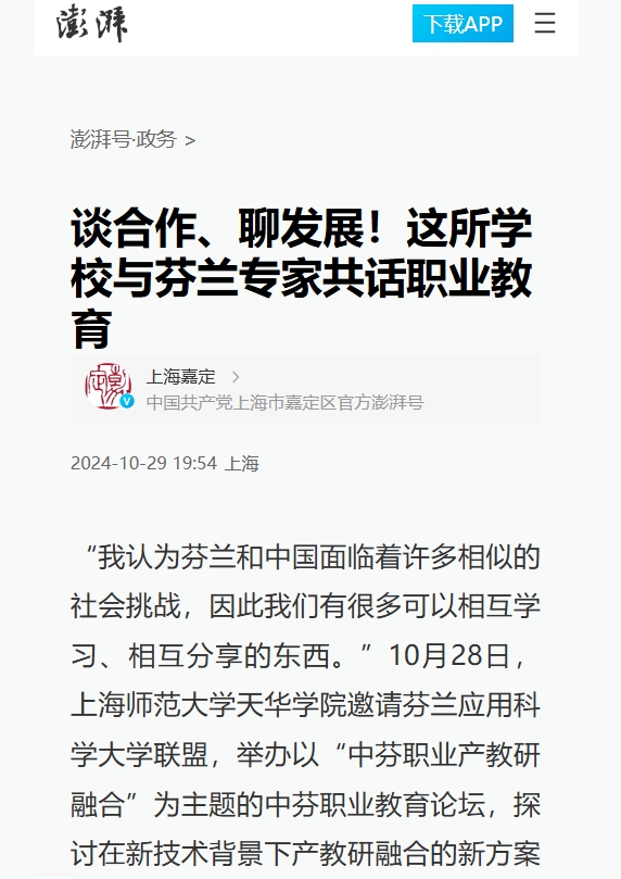 “我认为芬兰和中国面临着许多相似的社会挑战,因此我们有很多可以相互学习、相互分享的东西。”10月28日,上海师范大学天华学院邀请芬兰应用科学大学联盟,举办以“中芬职业产教研融合”为主题的中芬职业教育论坛,探讨在新技术背景下产教研融合的新方案和新途径。