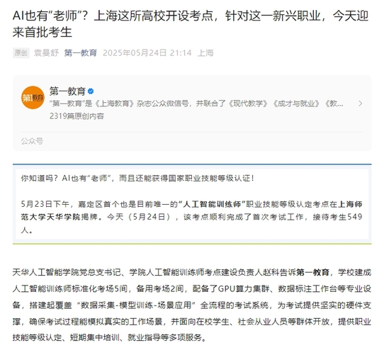 原文链接: AI也有“老师”?上海这所高校开设考点,针对这一新兴职业,今天迎来首批考生