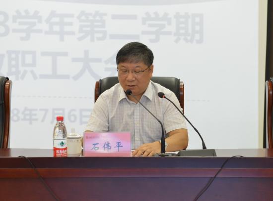 2018年7月6日上午9点,我校2017-2018学年第二学期期末教职工大会在晖华楼报告厅隆重举行。董事长邹荣祥、执行董事长石伟平、党委书记陆建非、校长叶才福、总校监郭伟奇、顾问韩晓玉在主席台就座,校务委员会全体领导以及学校教职员工出席了会议。会议由执行董事长石伟平主持。