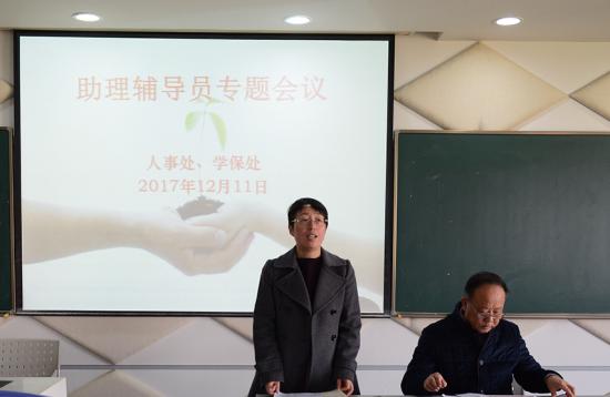 2017年12月11日,人事处、学保处在明华楼五楼演播中心召开助理辅导员专题会议,校党委副书记、学保处处长曹云林,校监、学保处副处长周烨刚,人事处常务副处长曹卫,学保处常务副处长刘天翔,团委书记包静波,各二级学院党总支书记,人事处处长助理李艳艳以及全校20名新教师出席会议。
