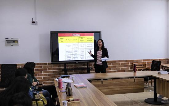 卜迅老师的研究话题是上海公立小学教师职业发展、自我效能和教师压力的关系研究,主要从研究问题、文献发现、研究方法、数据收集及分析的方法、研究结果、对未来研究的建议等方面进行了阐述,分享了自己在选定研究题目、确定研究方法、联系研究对象、发放调查问卷及分析数据结果时所经历的疑问、困惑及解决方法,并与大家讨论了研究结果的现实意义。