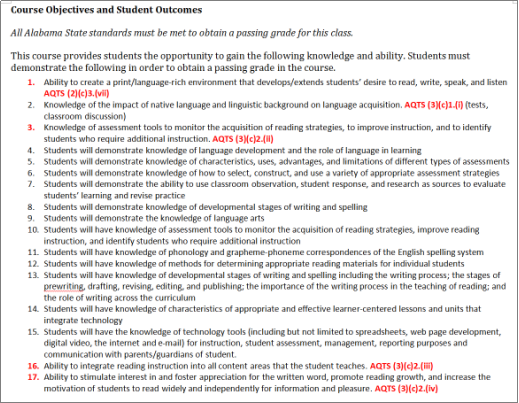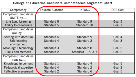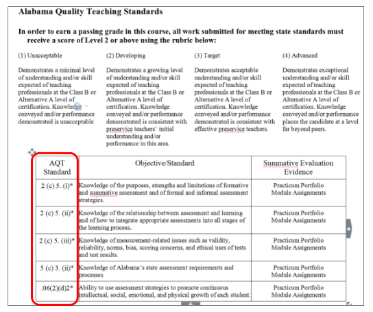 在此基础上,对人才培养方案和课程体系进行对照性的梳理,务必要让每一条NAEYC标准,每一条国家标准,在培养方案和课程体系中,找到对应的落脚点。以阿拉巴马大学教育学院为例(如下图1-5所示),专业认证标准在学院概念框架、课程实施计划、选用教材和学生作业四个层面都得到了体现,确保从管理者,到教师,到培养对象,对标准内涵都入脑入心。