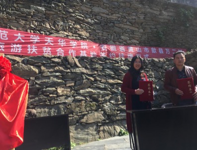 党的十九大作出了“坚决打赢脱贫攻坚战,让贫困人口和贫困地区同全国一道进入全面小康社会”的庄严承诺。旅游扶贫作为具有物质精神双脱贫功能的产业,作为最有尊严的脱贫,作为用美丽战胜贫困的产业,是国家扶贫战略的重要组成部分。为进一步加快落实国家扶贫战略,发挥高等院校帮扶贫困地区的社会服务功能,2017年11月5日,我校管理学院与安徽省黄山市歙县万二村共同签署“旅游扶贫合作协议”,并为“旅游扶贫合作基地”揭牌。