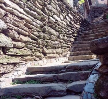 有建筑师说万二村是徽州山地村落的典型代表,有着“皖南的布达拉宫”之美称。这里寸土寸金,房子见缝插针、随形叠建,所以有长方的,也有异形的。村中祠堂右侧的石级小巷,约呈50度至80度上升,最高处几近垂直;这里只有高墙没有大院,小小村庄四层、五层楼房随处可见。几乎所有建筑都是经过石块护磅整形完成的,石磅无处不在、无所不能、无比风光;这里的土石匠手艺是一流的,再高的护磅也不用水泥,且百年坚固。村里道路全是石板,平铺的不说,许多逼仄处用石板挑空,堪称一绝。通俗的说万二村就是个用石头垒砌起来的村庄,是个石头村。因此我们说万二村的风貌是山地的、石头的,也是徽派的。这是我们近距离的观看,如果从岔口的文昌古道上远眺,万二与相邻的两个小村庄常年都在风景里。