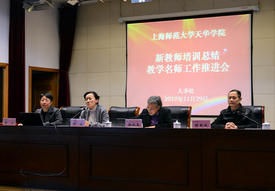 2017年11月29日下午人事处在学术报告厅举行新教师培训总结与教学名师工作推进会,党委书记韩晓玉,党委副书记、人事处处长许岳,副校长陈新斌,人事处常务副处长曹卫,教育学院院长滕薇,管理学院院长程葆青,语言文化学院常务副院长陈再阳,通识学院副院长裔勇刚,工学院常务副院长林军,艺术设计学院副院长朱花及全体新教师、教学名师出席会议,许岳副书记主持会议。