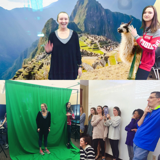 第一期教学技术工作坊中,Hardin博士就为师生们展示了如何应用绿屏抠像技术。必备的道具是一块可移动的绿色幕布,手机上下载绿屏抠像软件,简单介绍用法之后就可以设计教学了。Hardin博士演示的是他制作的一个创新自我介绍,用于小学课堂中。屏幕上的他周游世界,与动物亲密接触,和名人合影,引发学生阵阵笑声。