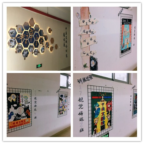 中英文辩论训练作品展的墙面布置采用了六边形的软木板,软木板设计可以实时更新墙面内容,以最小的成本创造了最大的成效,能让老师同学们更加直观地了解艺术设计学院各阶段中英文辩论训练进展;三楼经典阅读作品展利用黑色铁架框为背景,悬挂各班级围绕经典阅读学习创作的海报和心得体会。学生们以漫画、插画、海报、书籍设计等形式重现经典名著中的故事与哲理,以浅显易懂的连环画,描绘书中丰富内涵与人生哲理;立体与半立体的创意书籍、海报、2017级全体新生个人照片组成的“LTH”(爱天华)照片合影墙,给参观的师生们留下了深刻而难忘的印象。