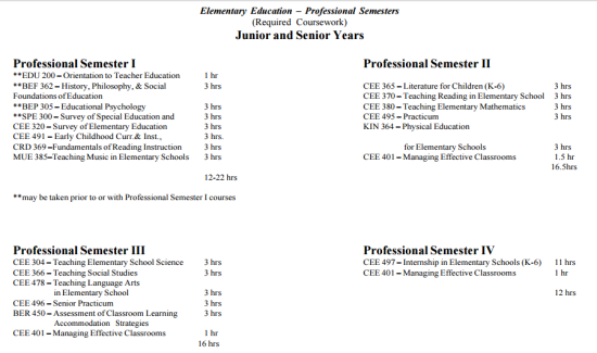 专业学习的第一,二和三学期,分别有一门课程与教育见习有关,它们是第一学期的小学教育研究(Survey Elementary Education),第二学期的实践课程(Practicum)和第三学期的高级实践课程(Senior Practicum)。小学教育研究是入门课程,要求学生完成40小时的教育见习,了解教师这个行业。课程内容涉及为什么要开展教育,如何做到有效教学和怎么使用教育技术。通过采访教师,参观学校,观察课堂,了解家长,最终认识教师这个行业。 实践课程引导职前教师视角从大学生向小学教师转变。课程要求学生完成至少26天的教育见习。见习期间,每个学生都有一个小学教师负责。在课程中,学生思考高效率教师的特点,学习如何撰写教案,掌握有效教学策略,认识行动研究,平衡标准和创造力,了解怎样进行教育合作。高级实践课程鼓励学生做行动研究(Action Research),学生就见习经历中出现的问题,进行反思,提出自己的想法,制定行动方案和实施,最后汇报研究结果。