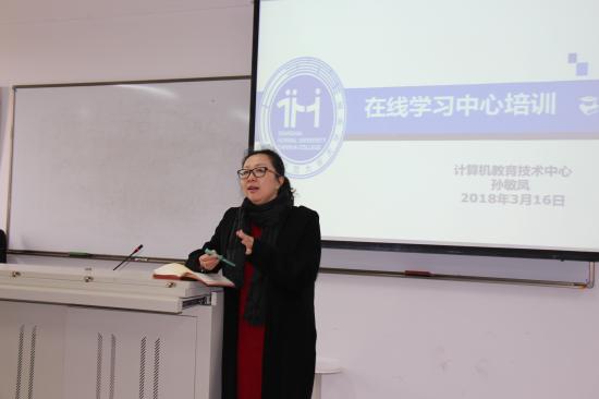 接下来,计算机教育技术中心主任孙敏凤老师向参会教师介绍了在线课程的建设流程、课程设计、在线学习中心平台建设、移动端功能和特点等内容,并结合教学实例,演示了在线学习中心平台中的微课视频、文档、班级管理、教学团队管理、题库、统计和答疑等各个模块的操作及使用。随后,孙敏凤与参会教师就移动端的在线答疑、学生讨论、签到等功能和特点进行了深入互动。在最后的交流环节,孙敏凤老师一一解答了老师们在建设过程中遇到的各种问题。