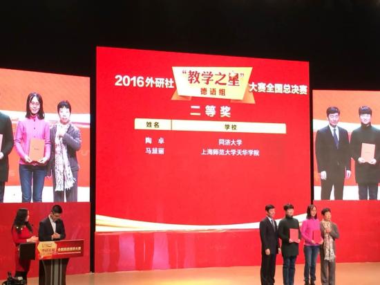 “德语教学之星”大赛面向教授大学德语、公外德语的全体教师,从5月的初赛到7、8月的复赛以及12月的全国总决赛,经过半年的赛程,来自同济大学的汤春艳老师荣获一等奖,我校马慧丽老师和同济大学陶卓老师获得二等奖,大连外国语大学张岩老师、同济大学赵亘老师以及山东大学(威海)张雄老师获得三等奖。
