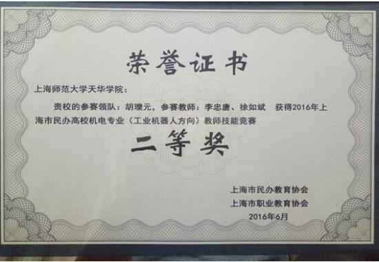 2015年6月21日至25日,上海市民办高校机电专业(工业机器人方向)教师技能竞赛在上海电气集团培训基地举行,来自上海市14支民办院校教师团队报名参加了此项竞赛,我校工学院胡瓅元、实训处李忠唐和徐如斌在为期一周的技能培训与竞赛中,最终以第二名的总成绩荣获二等奖,其中李忠唐和徐如斌两位教师还获得“FANUC工业机器人高级程序员”荣誉证书。