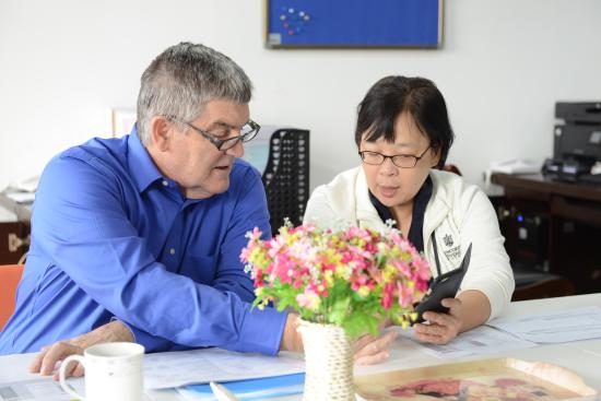 (康复专业主任Dr King与国际交流主任Christine Kao讨论安排细节)