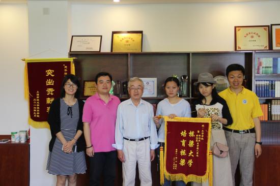 5月26日上午,为表感激之情,徐一心老人再次来到学校,给学校和两位学生送上了锦旗,学保处常务副处长刘天翔,管理学院党总支书记王一青,辅导员曹佳妮,以及学生李怡慧、邹屿英在月华楼270会议室与老人会面,并接受了锦旗。