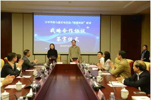 嘉定电信局党委书记、局长钱名海表示嘉定电信将充分发挥运营商在基础网络、信息化应用上的技术优势,提供优质高效的网络运营和IT运维服务,在数据中心建设、大数据分析、移动校园网建设等项目有广阔的合作前景,通过业务驱动技术,共同推动天华学院“智慧校园”建设。