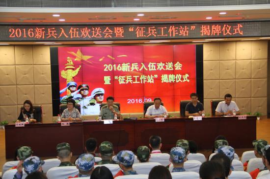 2016年9月20日下午13时,我校武装部在晖华楼小剧场隆重举行2016年新兵入伍欢送会暨征兵工作站揭牌仪式,嘉定区征兵办主任、区武装部部长于森鹤,校党委副书记、学保处处长、武装部部长曹云林,学校教务处副处长王慧,学保处副处长、校团委书记包静波,资助中心主任李婉璐及各二级学院党总支正副书记以及相关班级正副辅导员、部分家长出席了会议。会议由学保处副处长刘洪伟主持。