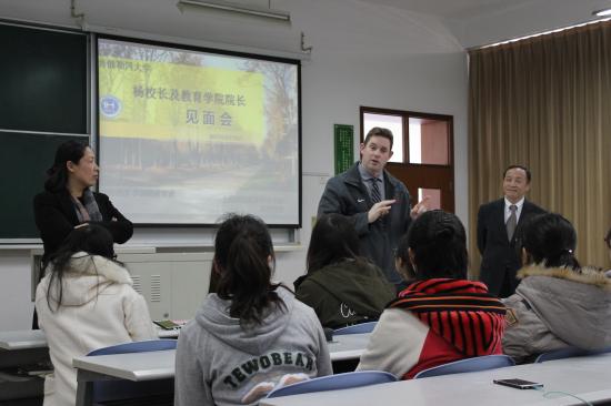 3月15日12:40,美国西俄勒冈大学校方代表与我校2016级中美合作学前教育专业学生见面会,在日华楼日阶204教室正式召开。本次见面会由美国西俄勒冈大学副校长杨能强与西俄勒冈大学教育学院院长Dr.Mark Girod主讲,针对教育学院2016级中美合作学前教育专业学生在美国的课程设置和生活做了相关介绍和解答。