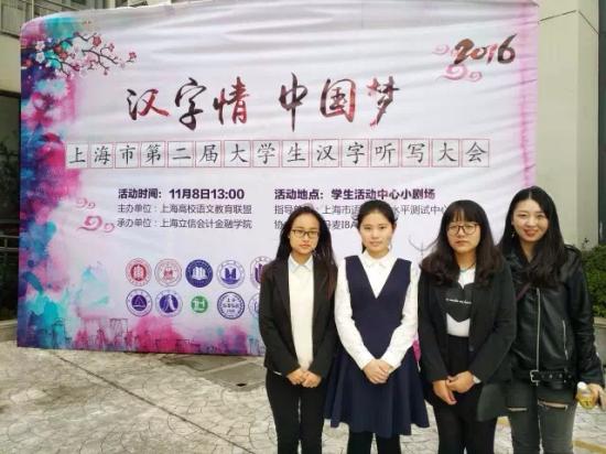 2016年11月8日,由上海高校语文教育联盟主办、上海市语言文字水平测试中心指导、上海立信会计金融学院承办的“汉字情,中国梦”上海市第二届大学生汉字听写大会在上海立信会计金融学院举行。本次大赛共吸引了上海交通大学、同济大学、华东师范大学、上海大学、上海财经大学、上海外国语大学等18所高校代表队参加。我校语言文化学院王恺蔚、田冰茹、吉思三位同学代表学校参加了本此活动。上海立信会计金融学院副校长、校语言文字工作委员会主任顾晓敏,上海市高校语文教育联盟秘书长、市语言文字水平测试中心主任徐民杰致辞,分别针对汉字的文化内涵、民族意义和当下提笔忘字现象倡导兴汉字、正文化、振国风。