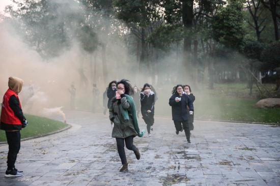 伴随着漫天的浓烟飘起,宿舍楼内消防警报声和消防疏散广播及时响起,同学们听到疏散指令和警报,立即用湿毛巾捂着口鼻,躬腰急行,在保卫干事和消防志愿者的引导下,快速地从各个楼层向安全区域疏散,面对遮天刺鼻的烟雾无所畏惧仍然有序的到达指定位置集合。