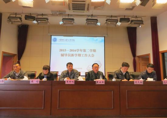 2016年2月27日上午9:00,学保处在明华楼报告厅召开了新学期辅导员工作大会,党委副书记、学保处处长曹云林,学校校监、学保处副处长周烨刚,党委书记助理凌琦,学保处常务副处长刘天翔,学保处副处长、校团委书记包静波,学保处副处长刘洪伟,以及各二级学院党总支正副书记和全体正副辅导员参加了会议。大会由学保处常务副处长刘天翔主持。