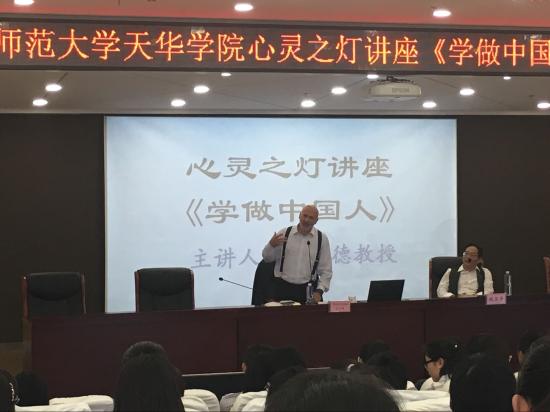 2016年5月20日下午15:00,心灵之灯系列讲座《学做中国人》在晖华楼报告厅隆重举行,特邀上海国际仲裁中心仲裁员、复旦大学高级律师学院实务教授孔宏德先生(Peter Corne)主讲,学校党委副书记、学保处处长曹云林、资产处处长朱清、学保处副处长刘天翔、校团委书记包静波、学保处副处长刘洪伟、二级学院总支书记、正副辅导员出席,由健康学院院长祝亚平主持讲座。