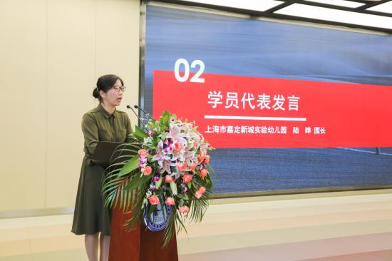 上海市嘉定新城实验幼儿园园长陆晔代表第一期研修班学员发言,希望藉此培训机会,在国内外教育专家高屋建瓴的指导下,全力以赴提升自身专业素养和管理能力,让自己成为习近平总书记所期望的“吐辞为经、举足为法”的幼儿园管理者。