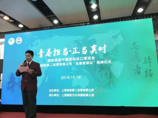 “志愿者驿站”揭牌仪式中,由地铁志愿者代表宣读了服务承诺,将有来自社会、学校和企事业单位共18个志愿服务团队近300人将参与到地铁第二运营有限公司八个重点车站备战进口博览会地铁双语志愿服务中,争做中国形象的展示者、城市文明的传递者、志愿精神的实践者。