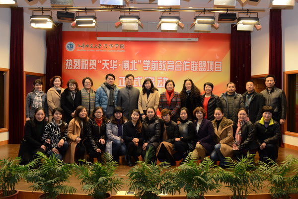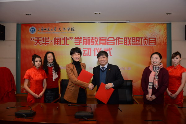 | 2013年12月27日,我校顺利举行了“天华•闸北”学前教育合作联盟项目启动仪式。闸北区教育局局长周隽、副局长孙忠,嘉定区教育局党委书记王晓燕,闵行区教育局副局长施云飞以及闸北区幼儿园园长共17人莅临参加仪式,我校总校监郭天成,校长石伟平,党委书记韩晓玉,常务副校长叶才福,副校长陈新斌、史文,党委副书记曹云林,财务总监李雅君,教学总顾问萧蕴诗,就业办主任吴莺以及教育与艺术学院教师和我校博士班代表共计80余人参加了启动仪式。仪式由校总监郭天成主持。 | ||