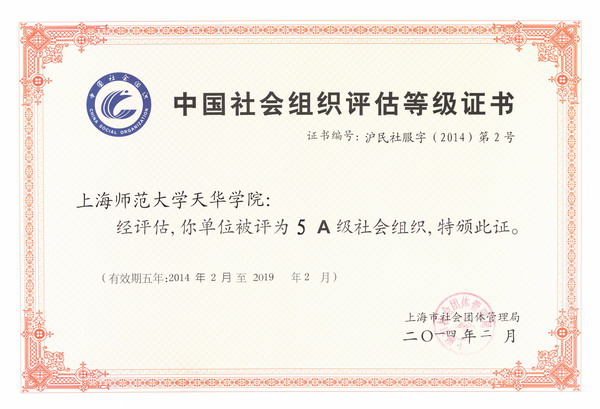 | 2013年,根据董事会及校党政监领导的指示,我校参与申报2013年度“市级民非单位规范化建设评估”。经全校上下一致努力,我校于2014年2月被上海市社会团体管理局评为上海市5A级社会组织。 | ||