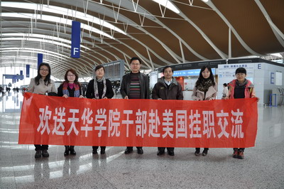 | 2011年3月17日中午12:30,天华学院第二批赴美国挂职交流的干部,由浦东机场搭乘美航班机飞赴美国太平洋大学,代表团由王友根老师带队,组员为赵睿、王茜、范君艳、岳远洋、张云,共计6人。学院常务副院长叶才福亲自赴浦东机场送行。 | ||