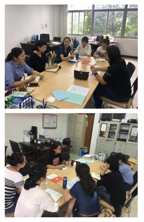 大学英语教学部围绕“智慧课堂设计”研修交流开展了讨论。全体大英部教师参加了讨论。在会上,袁振老师分享了暑期外研社研修会议学习心得。2017年8月袁振、李柯颖、王珊珊和陈嘉扬四位教师赴成都参加外研社题为“智慧设计:搭建通向智慧桥梁”的研修会并观摩“教学之星”全国教学大赛,为期三天。袁老师介绍了外研社及英语教学专家所倡导的“智慧设计教学,培养国际人才”的教学变革新趋势,分享了研修学习中教师需要“内外兼修”的学习心得。最后,孙超老师布置了新生入学分级测试工作,黄蔚老师落实了开学初大学英语各项工作。