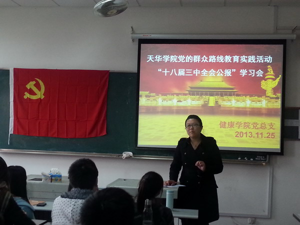 | 2013年11月25日,健康学院党总支召开了“党的群众路线教育实践活动之十八届三中全会公报学习会”。党总支书记孙超、党总支副书记周建光,党支部书记黄璐以及全体教师、学生党员,预备党员和入党积极分子参加了本次活动。 本次学习会主要对“十八届三中全会公报”进行解读,了解公报的涵义、内容,开展小组讨论。教师代表代维祝和学生代表范圳莉就个人对于“三中全会”重点问题的关注和理解开展了热烈的交流并分享了各组的心得体会。 最后,党总支书记孙超强调了本次学习会的重要性,并总结了党总支自2013年9月份以来开展的各项“群众路线教育实践活动”,要求教师党员、学生党员不断提高对自己的要求和标准,进行自我剖析,发现问题,解决问题,教师在工作中要以“爱学生”为宗旨,学生党员和积极分子要发挥先进性和模范性,真正发挥凝聚力。 | ||