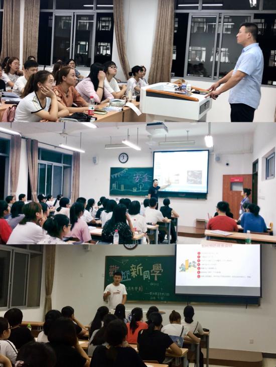 2018年9月16日,经过两天紧张忙碌的迎新工作以后,语言文化学院2018级新生的入学报道工作顺利完成。各新生班级在全体新生辅导员及班助理组织下,在日华楼各固定教室召开新生见面主题班会,晚上18:30,在固定教室开展了安全教育班会,由各班副辅导员主讲。