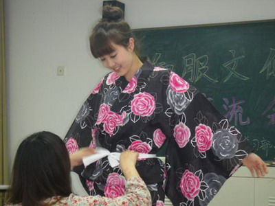 | 5月19日,日语系学习部和樱色物语社团在多媒体小教室举办了日语系第二届文化周系列活动暨和服文化交流会。 活动分为和服文化介绍、日本动漫经典片段欣赏和和服试穿三部分。会上介绍了和服的来历、种类,重点介绍了留袖和服、振袖和服、访问和服和小纹和服及穿着场合的差异。动漫经典片段的展映,吸引了所有观众的眼球,让人回味无穷。和服试穿更是满足了同学们的好奇心,将活动推向了高潮。 本次活动以“丰富课余生活、亲近日本文化”为宗旨,受到了广大日本文化爱好者的喜爱和好评(日语系) | ||